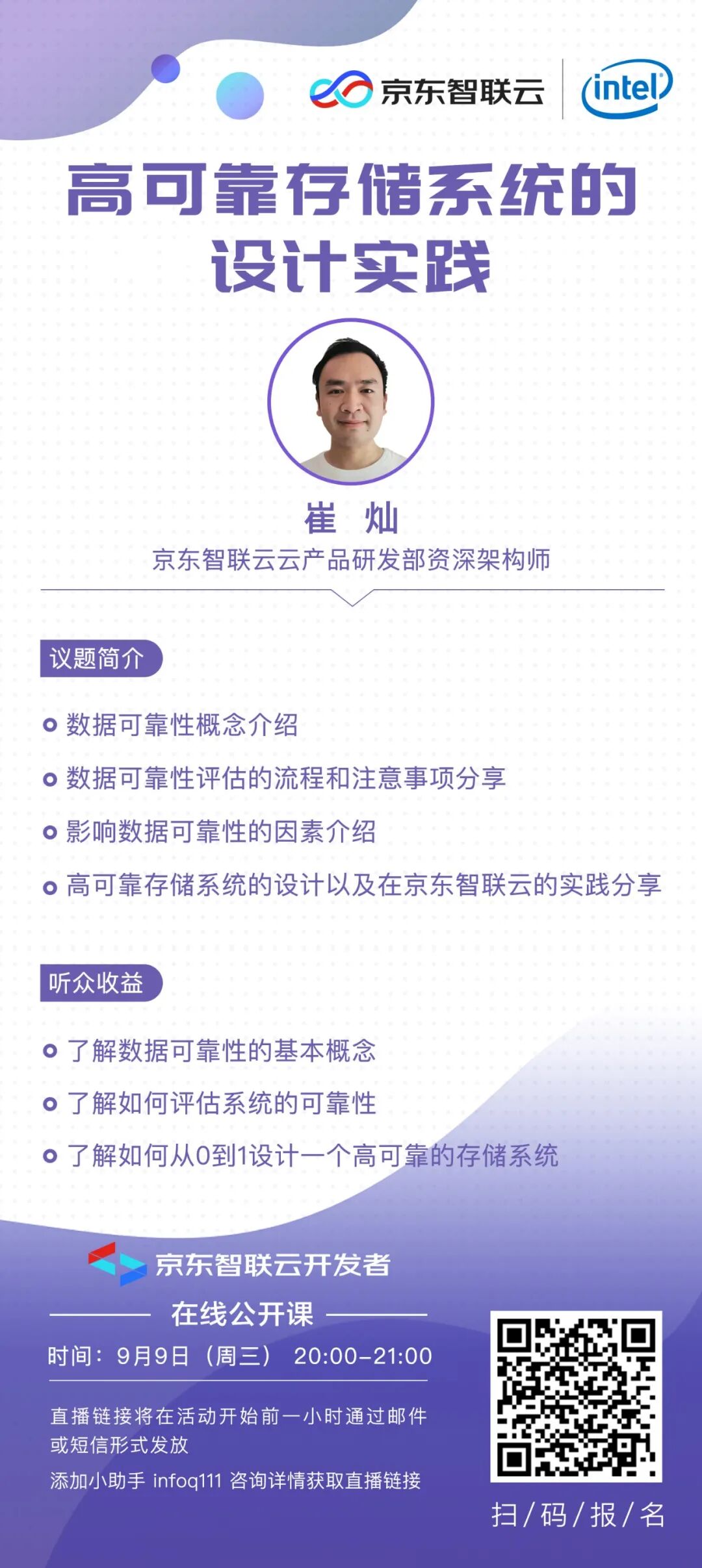 9月9日晚20:00,京东智联云云产品研发部资深架构师 崔灿,将会为大家带来主题为“高可靠存储系统的设计实践”的直播分享,教你如何从0到1设计一个高可靠的存储系统。