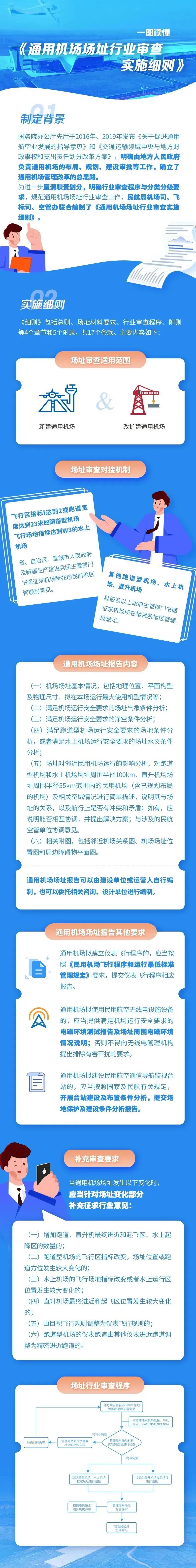 答:通用机场服务领域广泛、分类复杂、建设需求差异大,选址是机场建设的第一步,也是行业管理部门与地方政府工作协同配合的起始端。因此,《细则》的发布,能够厘清民航管理部门与地方政府在场址审查中的职责和衔接机制,明确了各类通用机场场址审查的内容要求,提供了规范的审查程序和流程,为机场投资建设单位提供清晰、统一的指标体系,为通用机场的稳步有序发展,打造低空经济发展新动能进一步夯实基础。