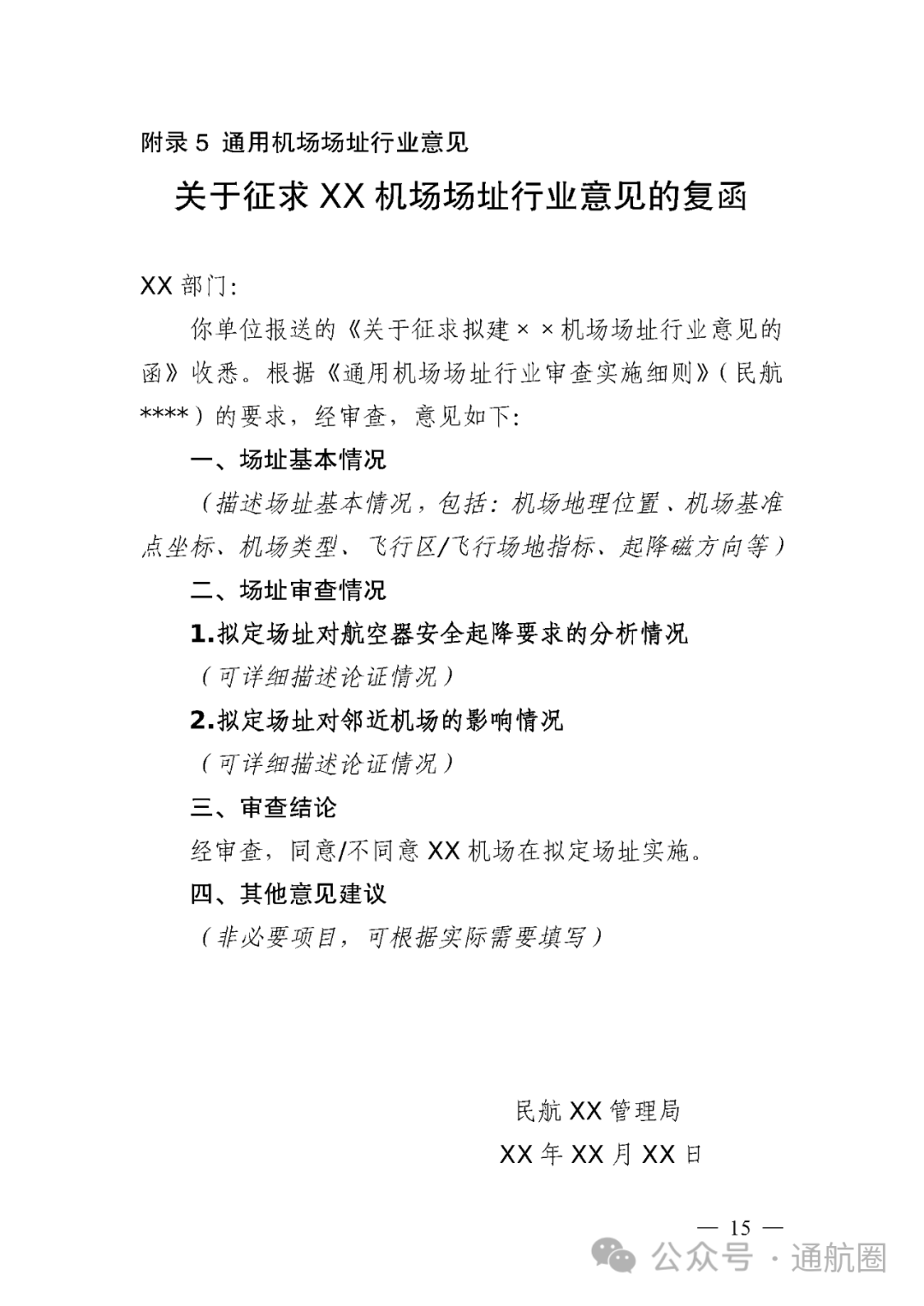 《细则》正文共有四章,十七个条款,还有5个附录。正文的四个章节分别是总则、场址材料要求、行业审查程序和附则,分别明确了职责与对接机制、场址报告的内容、管理局具体实施审查的程序等内容。在附录中,分别提供了征求意见函的样式、机场建设概况表、场址报告材料内容、场址行业意见办理流程图以及场址行业意见样例等内容。