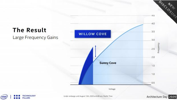 英特尔正式公布了 Tiger Lake SoC,采用了 Willow Cove 架构,官方称将提供超越代间 CPU 性能的提高。根据英特尔的官方文件, Willow Cove 架构下,处理器可在更低的电压下达到更高的频率。