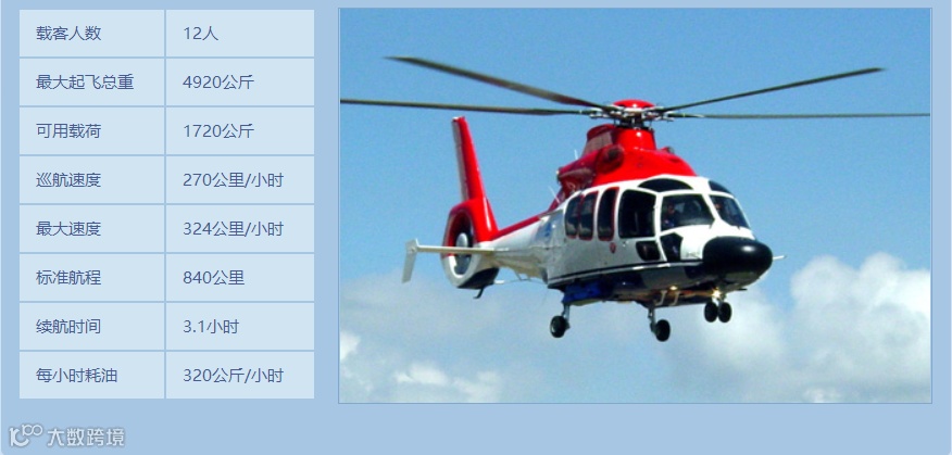 根据运维任务的内容来选择使用的直升机的机型,以空客EC155为例进行说明,其为中型直升机,可搭乘9名运维人员,1名机长,1名副机长和1名绞车手,具体参数如下。