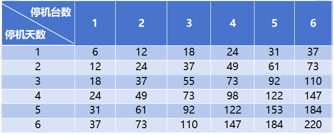 根据以下条件进行评估,海上风电场使用5.5MW机型,使用空客中型直升机EC155,每次可运送3组运维人员,从直升机机场到海上风电场接送一次共1个小时,直升机使用费用为5万元/小时,故障机组的平均功率按照3MW计算,挽回的损失发电量每度电价格按照0.85元计算。使用直升机开展运维工作,根据恢复停机台数和停机天数推算挽回的发电量损失金额可参照以下表1。