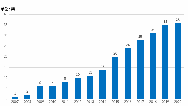 欧洲海上风电起步较早,直升机运维的规模自2007年始,逐年增长,至2020年达到36架,具体可见图4。