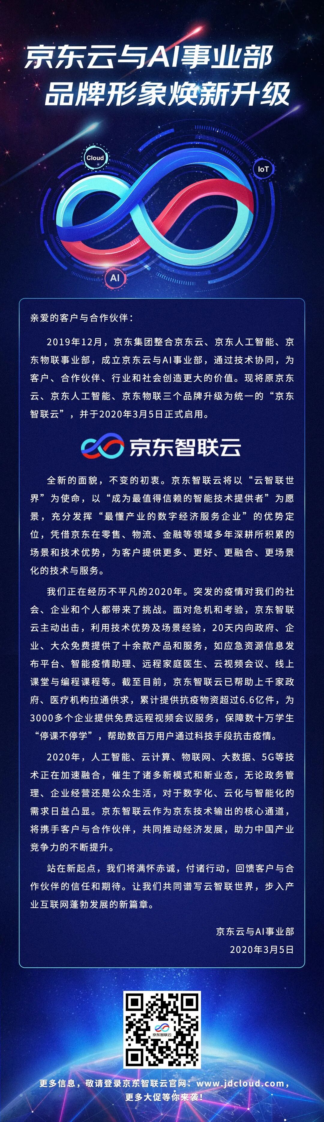 全新的面貌,不变的初衷。京东智联云将以“云智联世界”为使命,以“成为最值得信赖的智能技术提供者”为愿景,充分发挥“最懂产业的数字经济服务企业”的优势定位,凭借京东在零售、物流、金融等领域多年深耕所积累的场景和技术优势,为客户提供更多、更好、更融合、更场景化的技术与服务。