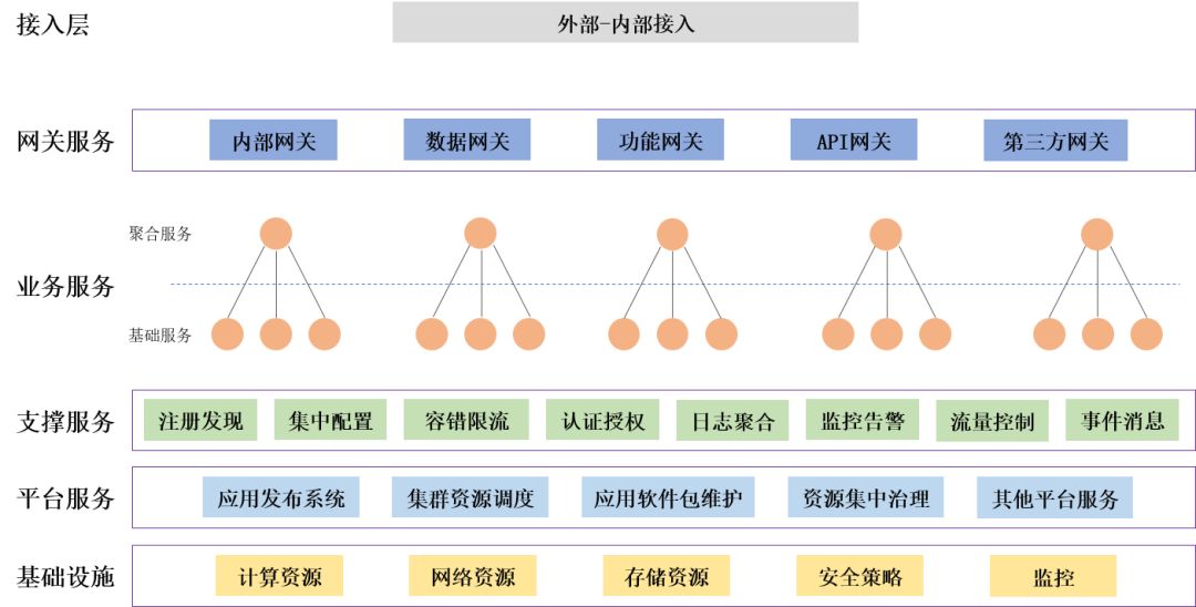 服务接入层:企业暴露到外部访问的入口,一般通过防火墙等。