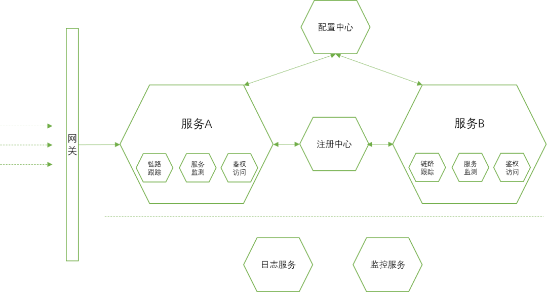 传统架构:传统架构下,支撑服务,业务服务基本上没有明确的边界区分,实现方式上都通过代码杂糅在一起。