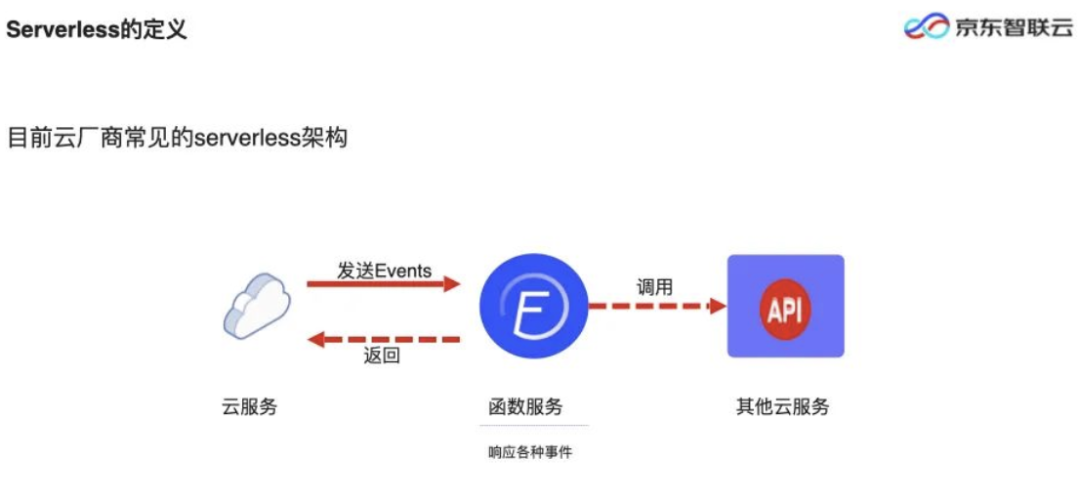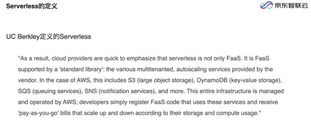 UCBerkley 曾对Serverless做过一个研究,主要强调了 Serverless 不是FaaS。各家公有云上都会有一些函数服务的产品,但这只是一个Serverless在计算层面上的抽象和实现,Serverless还有大量的服务,如 AWS 的 S3、京东的对象存储、KV存储等。Serverless 给大家带来的是便捷的申请,按需付费。