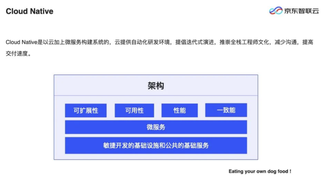也就是说,CloudNative 不是某一种技术或最佳架构方式,而是一种集合,一般情况下,它与云有强相关,包括公有云、私有云,包括京东、BAT 内部也有一些云的架构,云的基础设施,在此基础上搭建一整套研发流程和团队的工作方式。