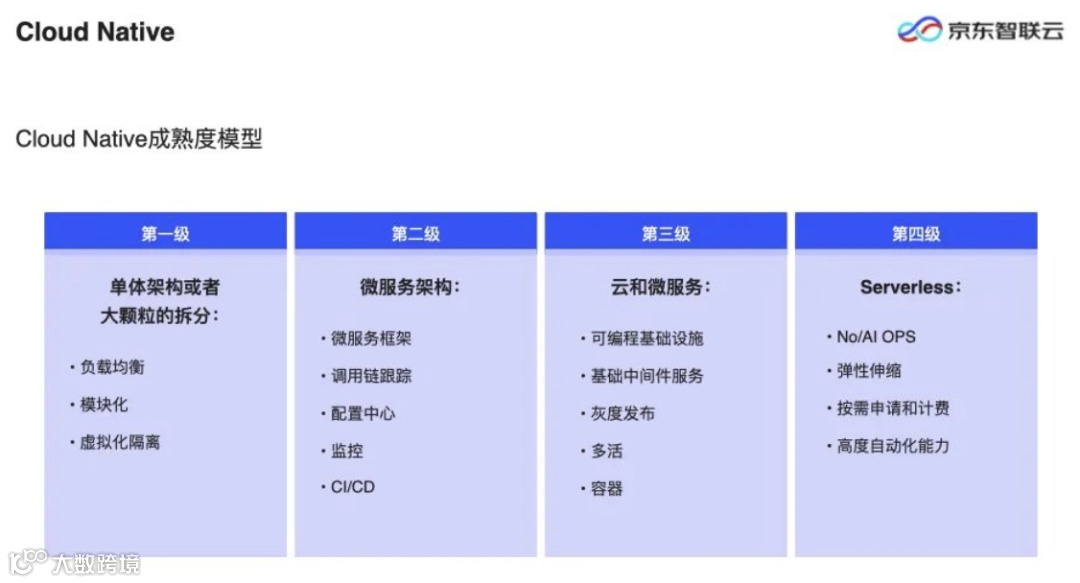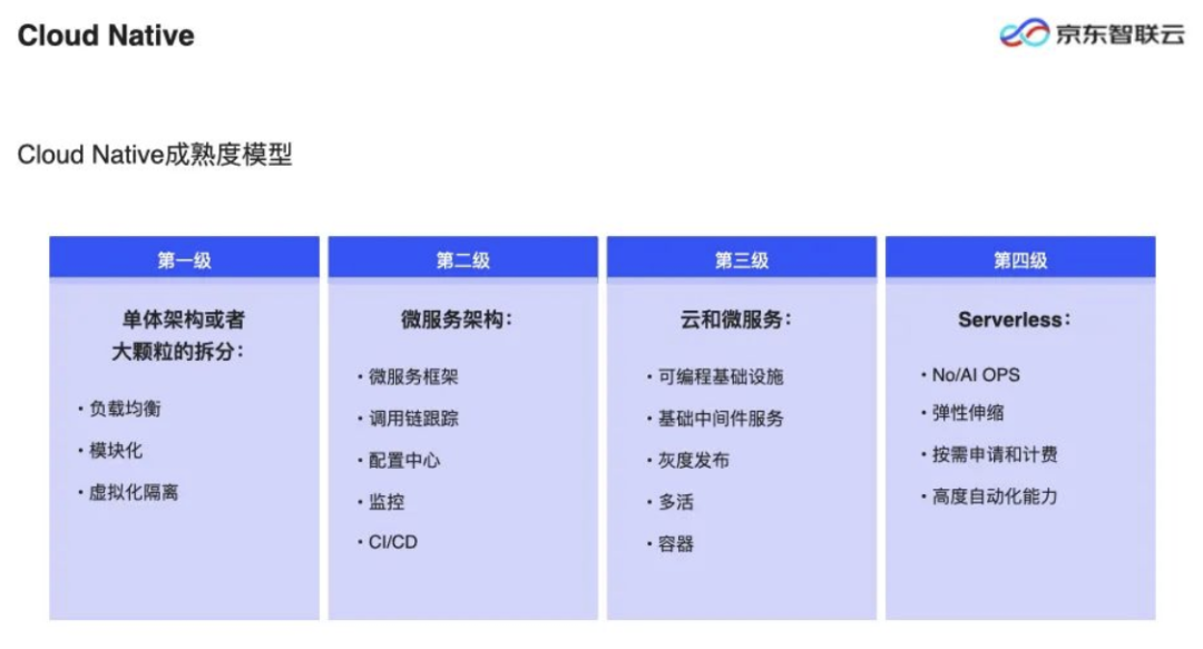 第四级:就是今天的重点,Serverless的几个主要特色有——1)免运维、甚至结合 AI 能力做运维的提升;2)弹性伸缩;3)按需付费;4)高度自动化和自愈能力等。