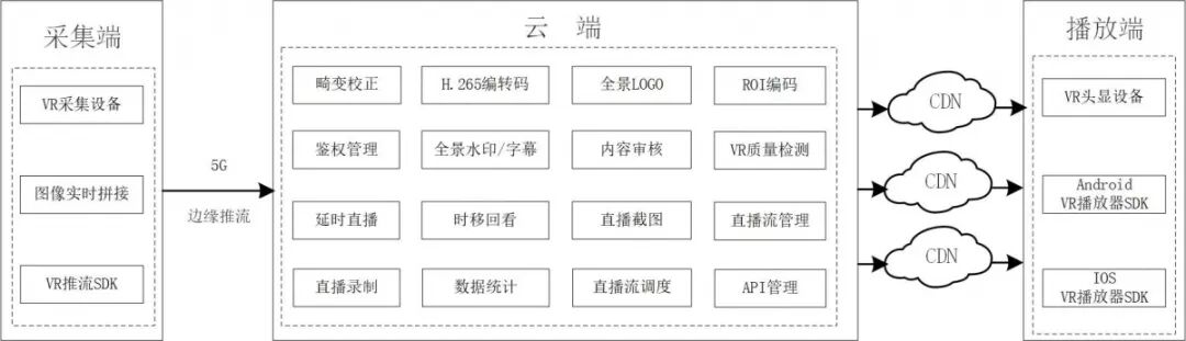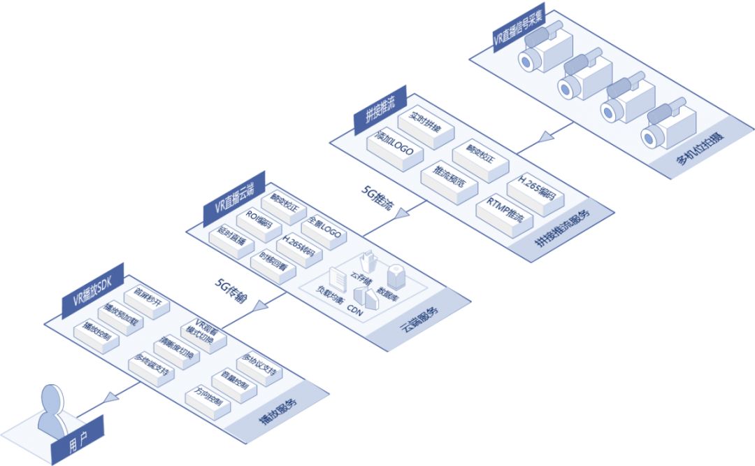 VR直播信号在采集的过程中是通过多机位、多角度拍摄的,所以在采集后需要对多个镜头的视频进行实时拼接,拼接通过时间坐标和空间坐标对视频进行缝合处理,同时进行畸变校正。完成拼接后,将正方向调整为影片想要表现的主体,从而为客户提供高质量的VR直播服务。