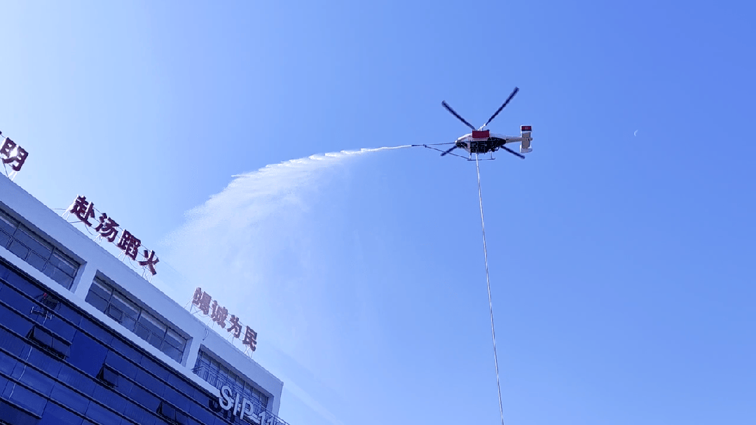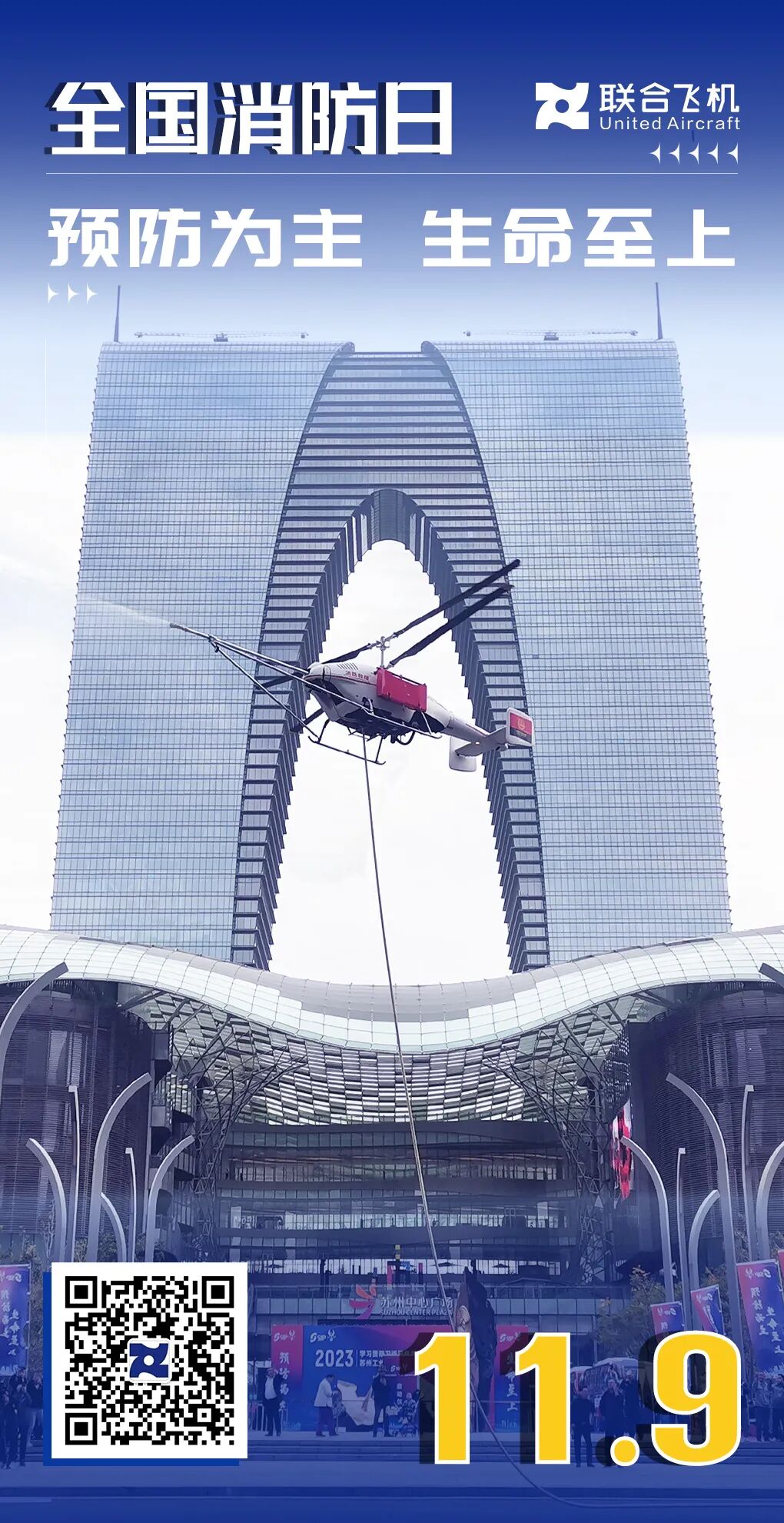 11月8日,联合飞机携大载重消防救援无人直升机TD550亮相2023苏州工业园区“119”消防宣传月启动仪式,在苏州城市上空演示现代消防科技的高空战法。