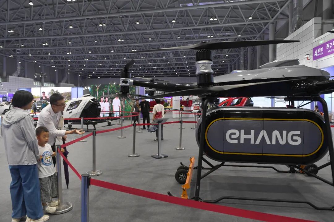 在2023世界制造业大会展馆,观众参观亿航展出的无人驾驶飞行器。合肥日报全媒体记者 张大岗 摄
