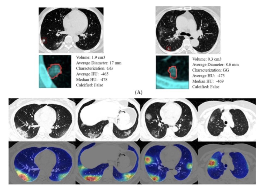 胸部CT冠状病毒与非冠状病毒的分类结果为0.996 AUC(95%CI:0.989-1.00),这是在中国控制和感染患者的数据集上的结果。实际使用的结果:灵敏度为98.2%,特异性为92.2%。对于冠状病毒患者,系统可对较小的不透明物(体积,直径)进行定量测量,并在基于切片的“热图”或3D体积显示中可视化较大的不透明物。本文提出的“冠状(Corona)评分”可以衡量疾病随时间的进展。