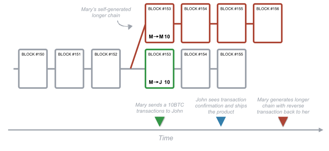 让我们看看Mary如何利用这种链末歧义来执行“双重攻击”(double-spending attack)的。Mary寄钱给John,John将产品寄给Mary。由于节点始终采用长链作为已确认的交易,因此,如果Mary可以生成包含相同反向引用的反向交易的长链,则John的资金和产品都将无法使用。