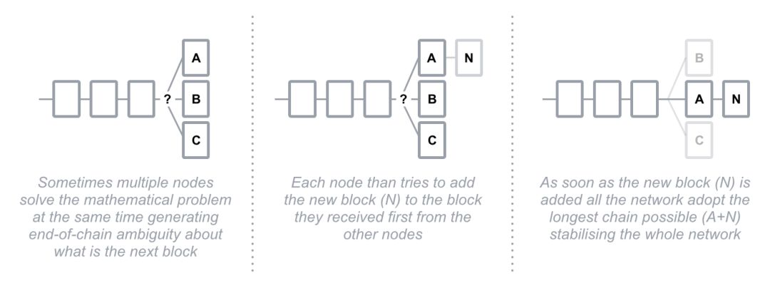 由于同时解决区块的可能性低,几乎不可能一次又一次地解决多个区块,构建不同的“尾巴”,因此整个区块链可以快速稳定到每个节点都同意的单个字符串区块。