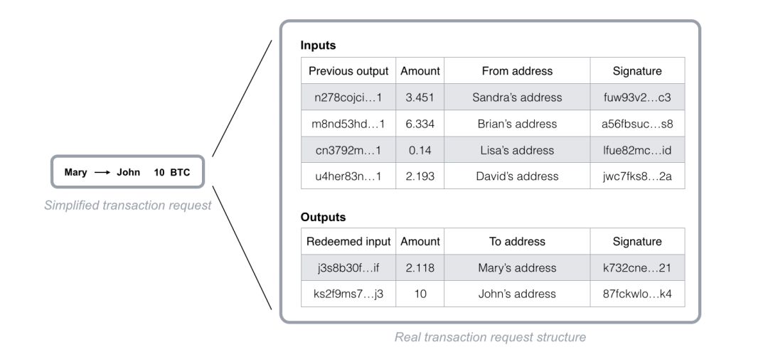 这种“余额”验证是基于到以前事务的链接执行的。也就是说,如果要向John发送10个比特币,Mary必须生成一个交易请求,该请求包括之前传入的交易的链接,这些交易加起来至少有10个比特币。这些链接称为“输入”。网络中的节点将对金额进行验证,并确保这些投入还没有被花费。实际上,每次你在事务中引用输入时,它们都将被视为无效的。这一切都是在Mary的钱包里自动执行,并由比特币网络节点进行双重检查;她只不过是使用John的公钥向他的钱包发送了一个10 BTC的事务。