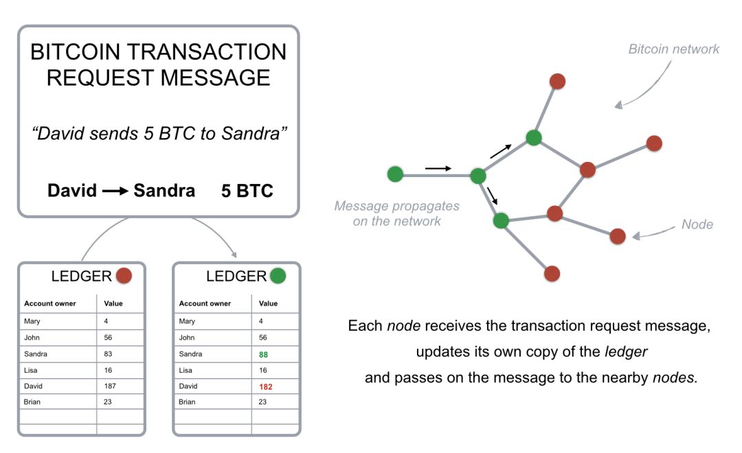 如果某天,David想给Sandra发送比特币,那么他会向网络发送一条消息,说他的账户里的比特币数量应该减少5个BTC,而Sandra的账户里的比特币数量应该增加5个BTC。网络中的每个节点都将接收到该交易消息,并将请求的事务应用到其分类帐副本中,从而更新帐户余额。