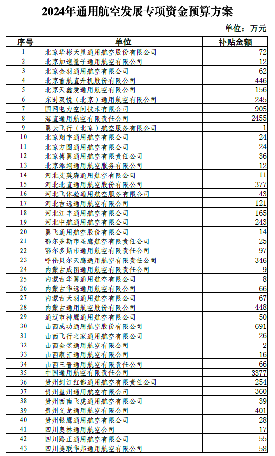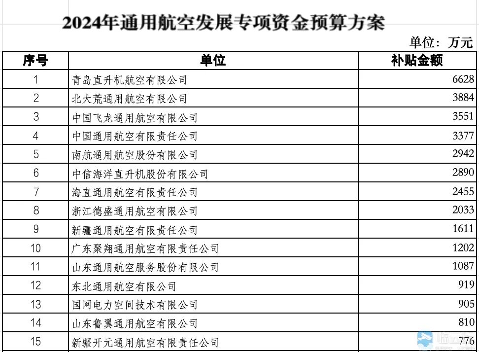 《2024年通用航空发展专项资金预算方案》显示,206家通航企拟共获59540万元的补贴,其中,青岛直升机航空有限公司6628万元,北大荒通用航空有限公司3884万元,中国飞龙通用航空有限公司3551万元。补贴金额排名前15的航企情况如下: