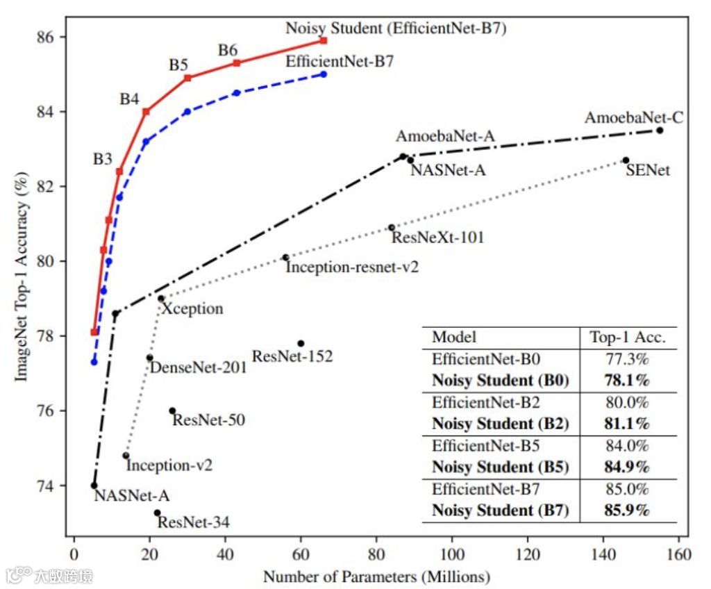 研究者首先在标注的 ImageNet 图像上训练了一个 EfficientNet 模型,然后用这个模型作为老师在 3 亿无标签图像上生成伪标签。然后研究者训练了一个更大的 EfficientNet 作为学生模型,使用的数据则是正确标注图像和伪标注图像的混合数据。在学生模型训练的过程中,研究者对数据加入了噪声,使用了诸如数据增强、dropout、随机深度等方法,使得学生模型在从伪标签训练的过程中更加艰难。