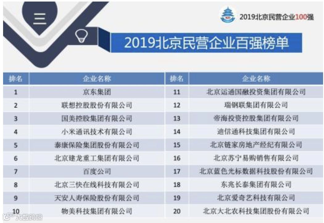11月15日,北京市工商联发布了2019北京民营企业百强榜单和专项调研报告。报告显示,京东集团以4620亿元营业收入总额再居北京民营企业百强榜首。京东集团、联想控股股份有限公司和国美控股集团有限公司蝉联前三甲,三者营业收入总额均超过3000亿元,同时跻身全国民营企业500强中的前十强。