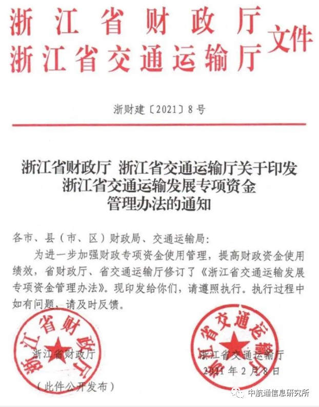 《浙江省交通运输发展专项资金管理办法》提出,对通用机场短途运输给予补助,即单条航线常态化运营1年以上,并在1个年度起落架次至少达到200架次的通用航空短途运输航线。每年每条航线按飞行时长给予相应补助,每条短途运输航线的补助期限不超过3年。