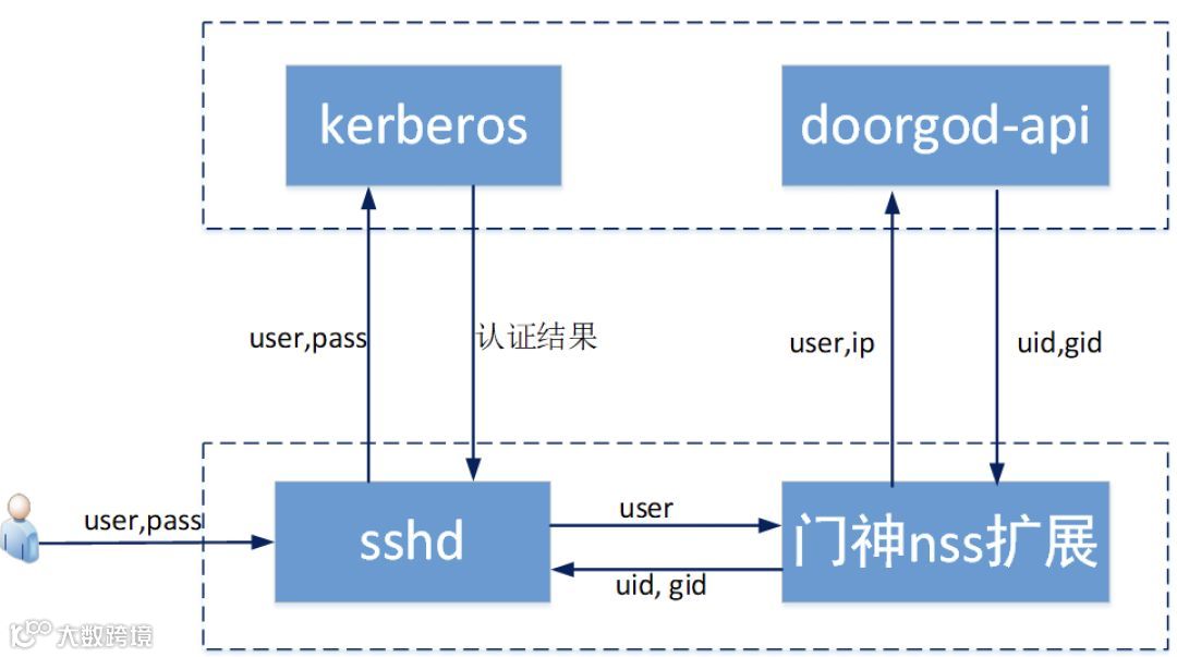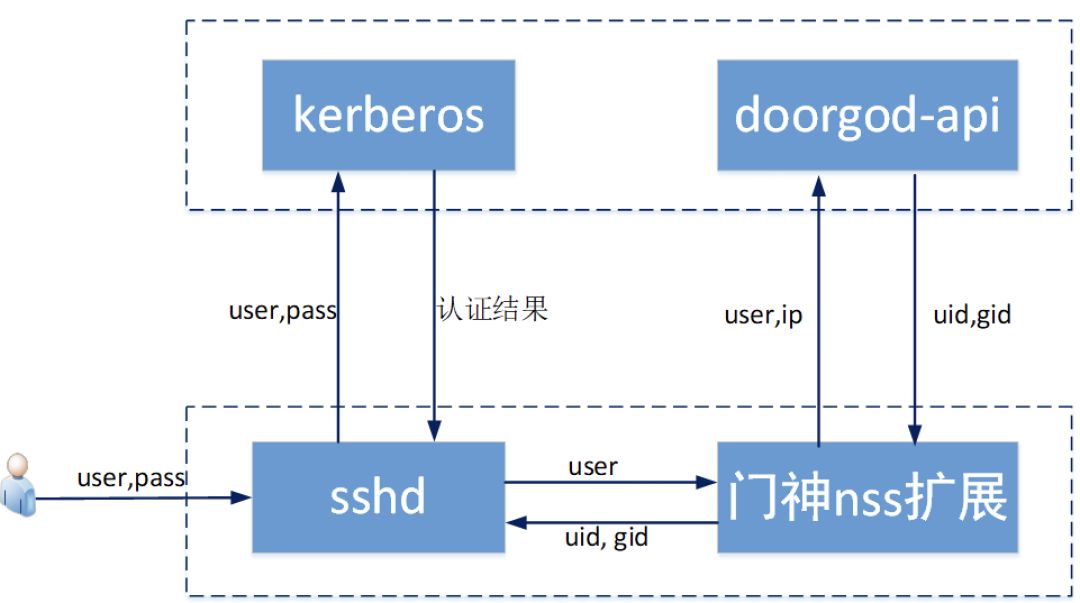 门神用户身份认证是基于kerberos协议,保证在非安全网络环境下的安全认证登录,并且实现一次登录relay后,在授权资源机之间可以免密穿梭。nsswitch扩展