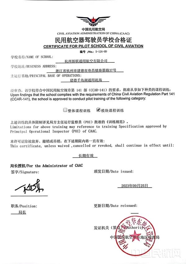 2023年10月7日,杭州新联通航取得了由中国民用航空华东地区管理局、中国民用航空浙江安全监督管理局颁发的CCAR-141部运行合格证,成为浙江辖区第一家CCAR-141直升机航校,主运行基地设在建德千岛湖通用机场。