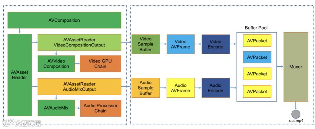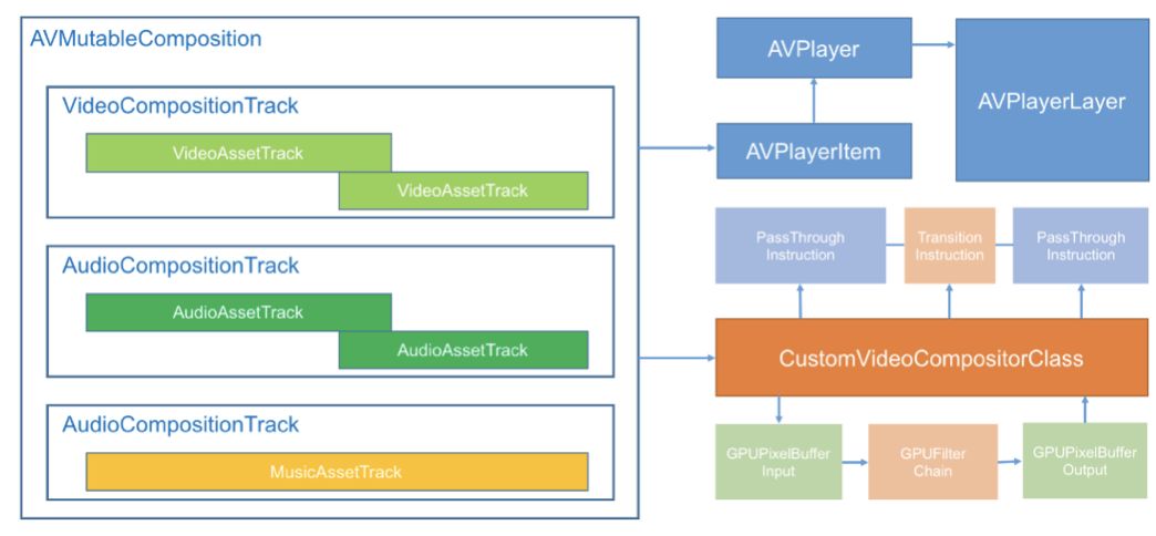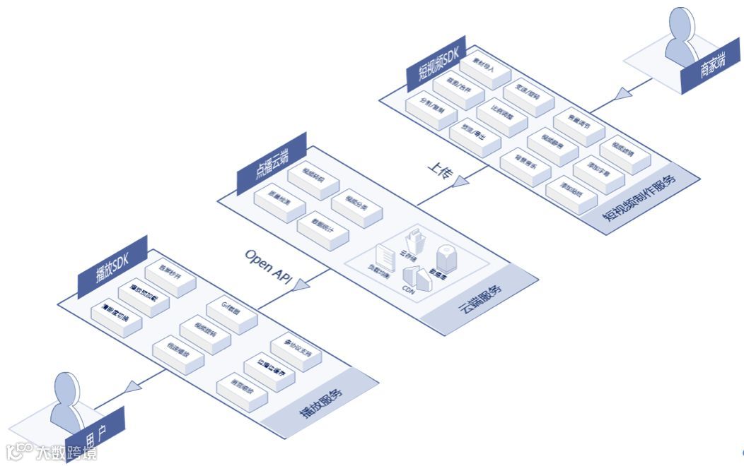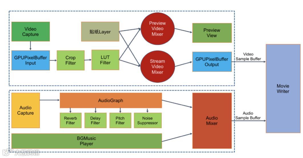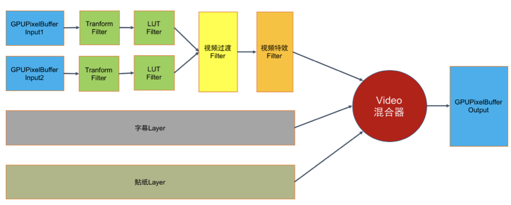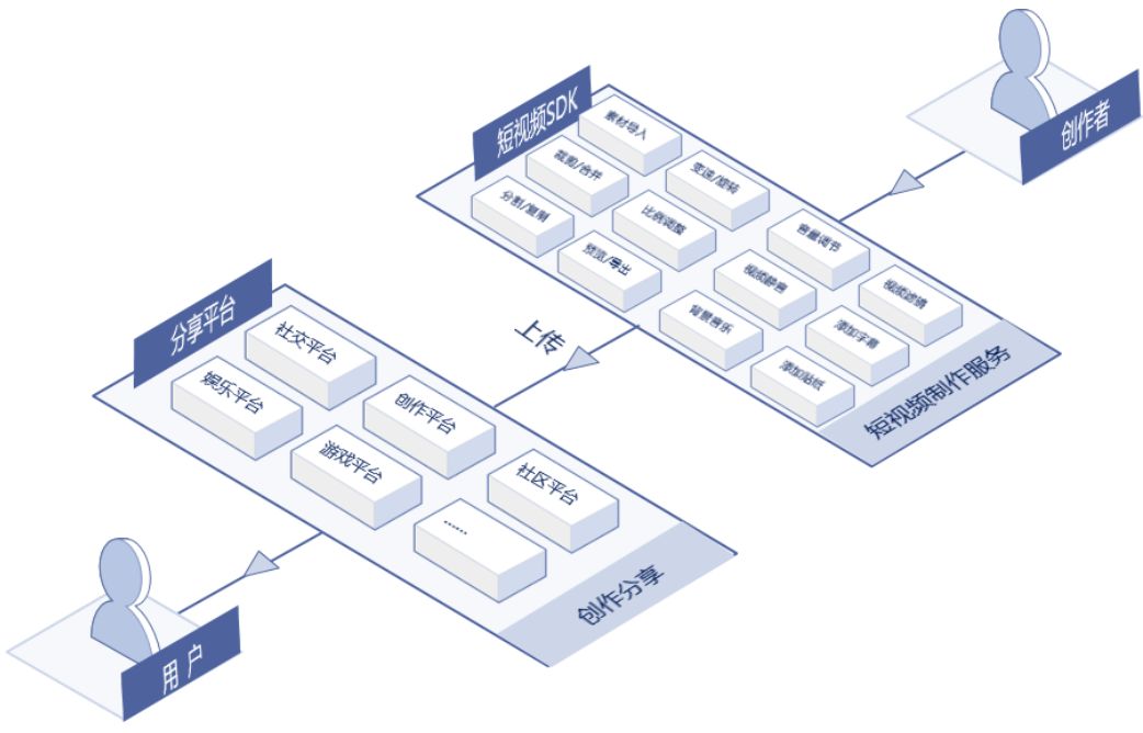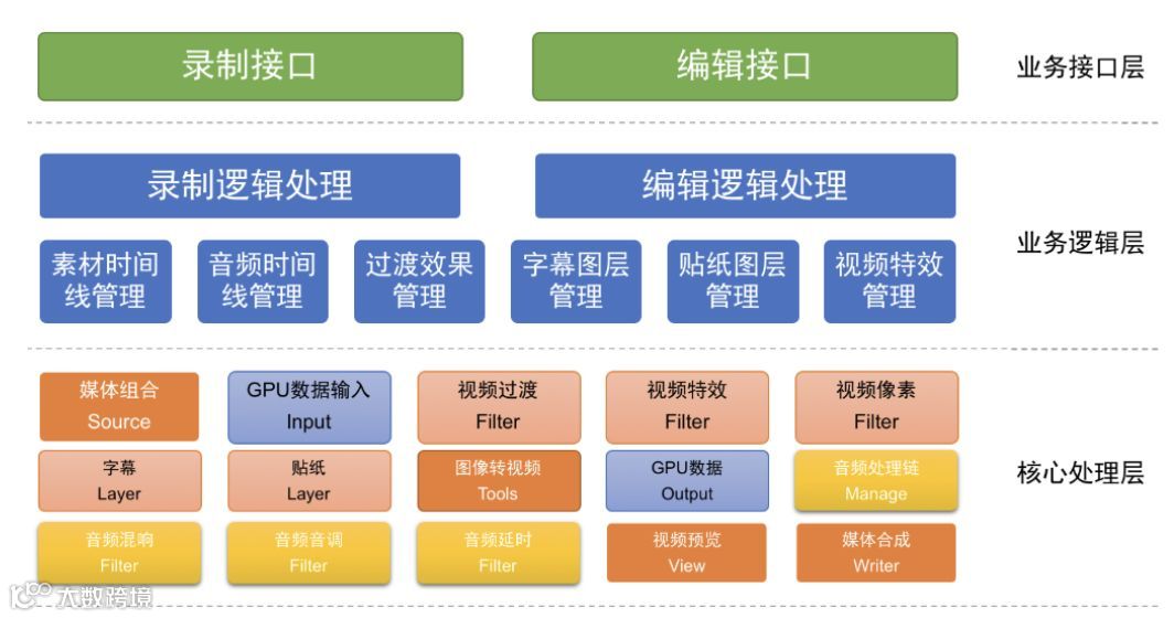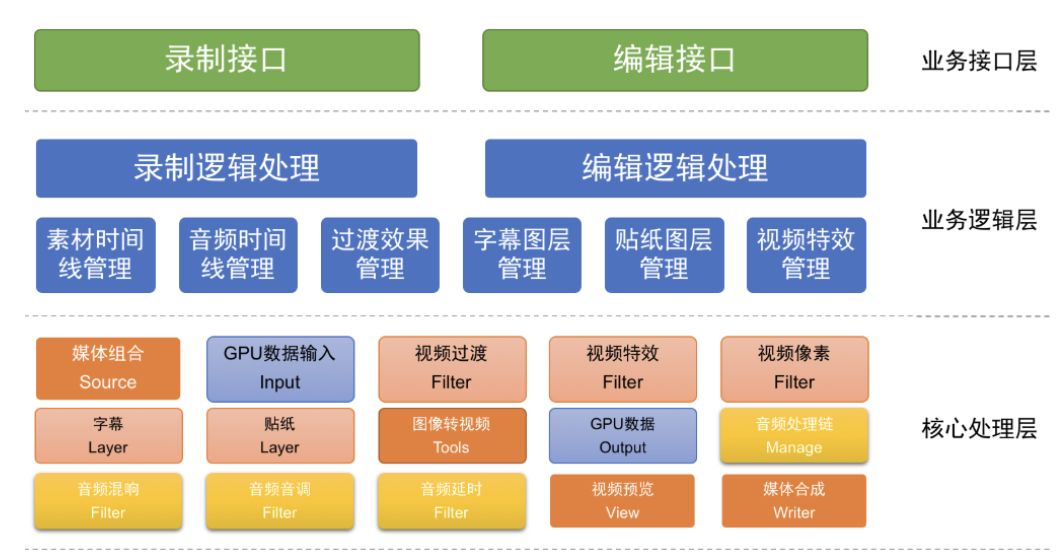核心处理层:负责短视频底层的技术实现,包括媒体组合、GPU数据输入、视频过渡、视频特效、视频像素、添加字幕/贴纸、图像转视频、GPU数据、音视频处理、音频混响、音频调节、音频延时、视频预览和媒体合成;