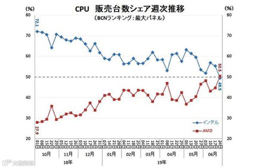 在日本市场上,AMD也要创造新的记录了。来自BCN Retail的统计数据显示,6月份的时候AMD的处理器销量份额达到了50.5%,超过半数,意味着Intel的销量首次低于50%了,双方首次出现了逆转。