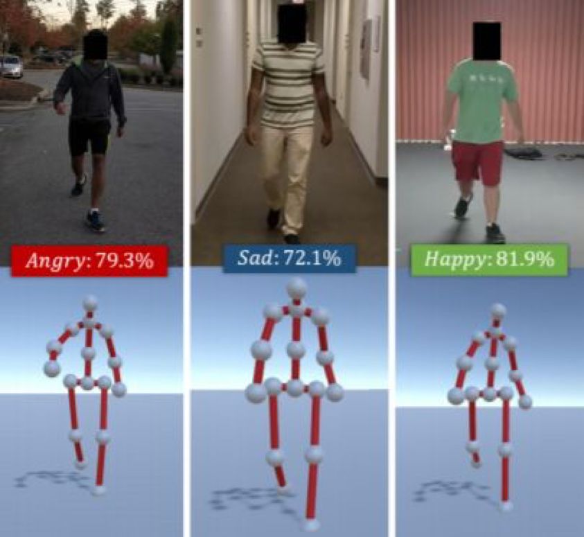 利用身体语言,教堂山大学和马里兰大学的研究人员最近开发了一种机器学习方法,可以从一个人的步态中识别人的感知情绪(例如,积极或消极,平静或精力充沛)。研究人员称这是第一种此类方法,并且在初步实验中取得了80.07%的准确率。