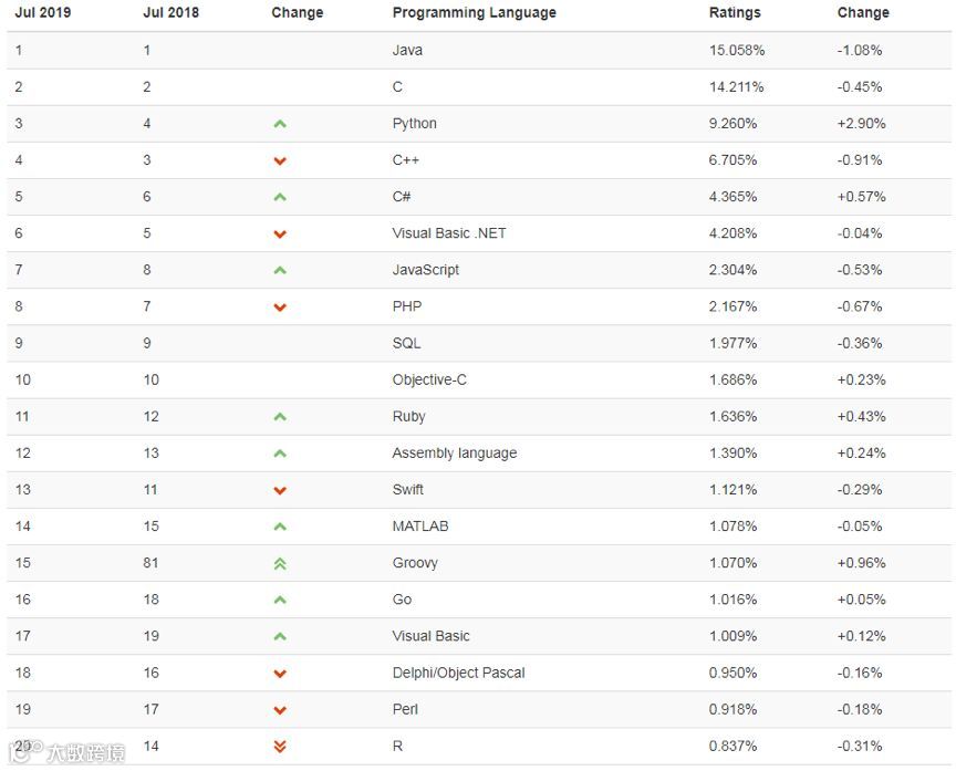 TIOBE 编程语言排行榜7 月更新已公布,排名前十的分别是:Java, C, Python, C++, C#, Visual Basic .NET, JavaScript, PHP, SQL 和汇编语言。和上个月的不同之处主要是C# 以微弱的优势超过了Visual Basic .NET 的排名,再次进入TOP 5。