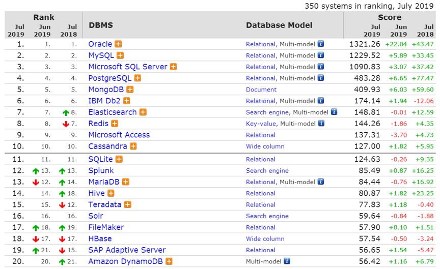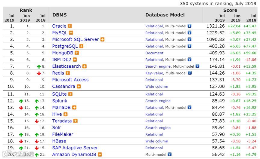 DB-Engines 数据库流行度排行榜7 月更新已发布,总体排名依旧是没有什么变化,虽然分数基本都有所增加,但可以看到,和去年同时期的相比,今年增加的分数稍显疲软。哪怕是分数增长最多的Oracle,在6 月也只是增加了22.04 分。
