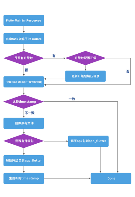 每次 init 的时候都会触发检查 data 分区的 app_flutter 包,如果不存在就会从 aaset 目录解压出来,而升级包的替换就是在这步完成的,按照逻辑会优先检查升级目录有没有包存在,如果存在则优先从升级目录解压,如果不存在还是从 asset 目录解压;