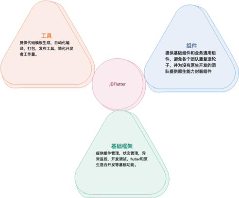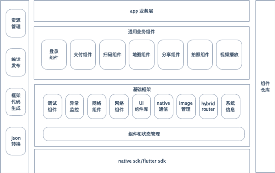 基础层:提供了Flutter的基础组件支持,包括组件管理,状态管理等;基础层完全独立,对业务没有依赖。