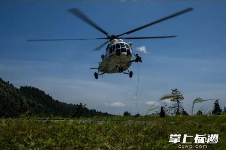 直升机下降至离地10米的低空悬停时,“下降”指令发出,特警队员们起身,一人先从舱门处抛下绳索,快速索降;另一人背着“飞侠”跟着索降而下。