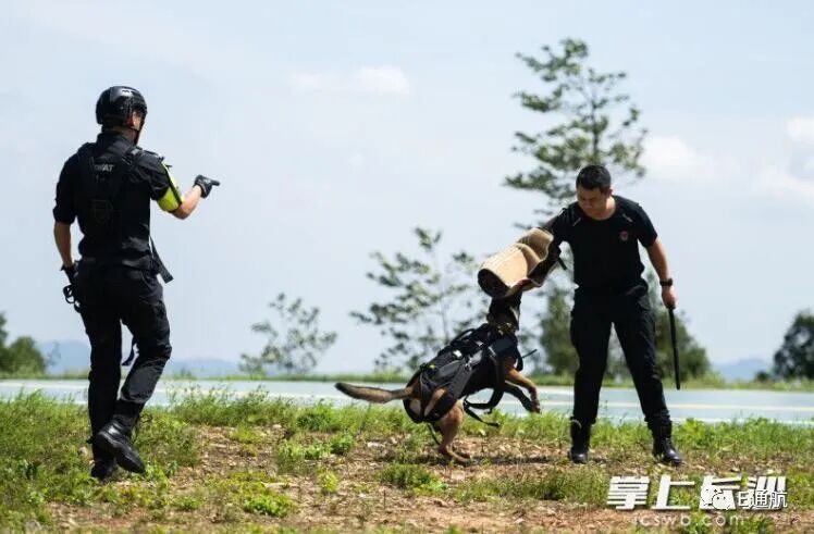 “‘飞侠’,上!”落到地面,特警队员解开绳索及包着“飞侠”的背包后,按模拟抓捕处置场景,发出指令。“飞侠”飞奔而出,将“嫌疑人”手臂咬住。特警随后赶到,将“嫌疑人”控制。