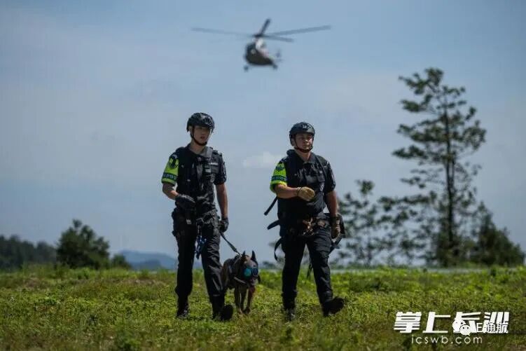 群山之间,一架直升机从高空突降,悬停之时,特警携警犬“飞侠”,顺着绳索快速滑降至地面。在特警发出指令后,“飞侠”奔至“嫌疑人”身前飞身扑咬,协助特警队员控制“嫌疑人”。9月19日,长沙市公安局特巡警支队第三特警大队队员开展携犬直升机索降实战训练。