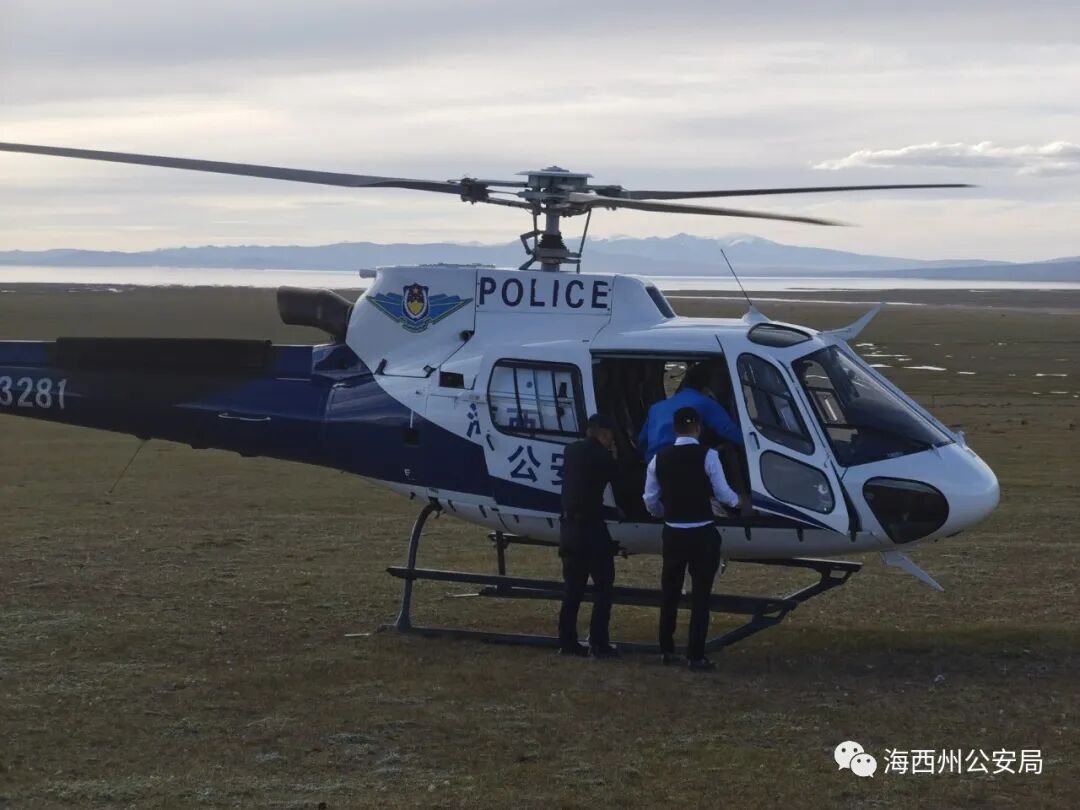 18时10分,在搜索飞行4个多小时后,飞行员发现了车辆被困于哈拉湖东侧海拔4300米的一片沼泽地。警用直升机安全降落,民警迅速查看并询问了七人的情况,其中两名女性、两名青少年有不同程度的高原反应。民警随即通过卫星电话向州局指挥中心报告了现场情况,并科学制定救援计划。轰鸣启动,低空慢飞,警用直升机在高海拔区域通过空中引导,将两台被困车辆转移至安全区域。18时50分,直升机再度启航,搭载四名身体出现不适症状的游客,第一时间送往德令哈市。天峻县公安局、德令哈市公安局增援警力,以及应急管理部门工作人员做好救援工作的地面接力,共同引导、协助游客,于23时许将两台车辆安全护送驶抵德令哈市。出现高反症状的游客,经医护处理、休息休整,身体状态已恢复。