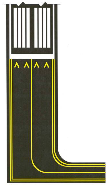 跑道入口调整的标志中没有与跑道中线组成的长箭头,如果跑道入口以前的部分跑道仍然可用,则会当做滑行道使用,道面上会画上黄色的滑行道中线和边线,如下图: