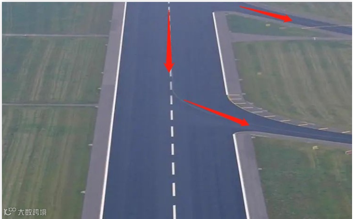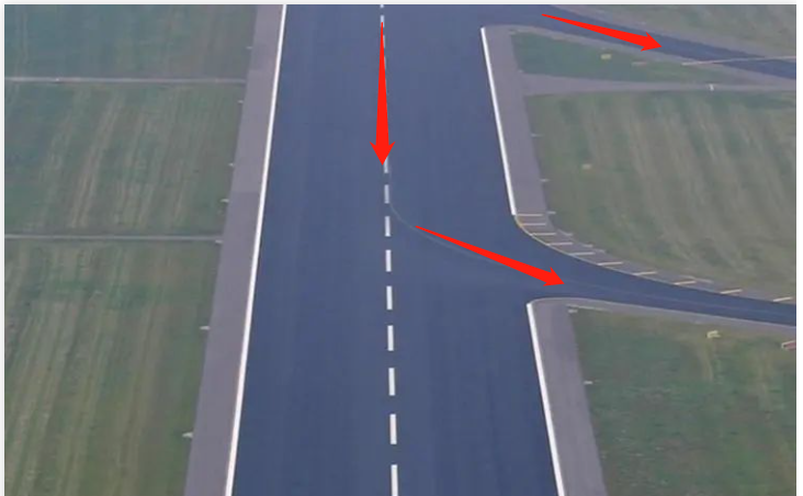 顺便提一下“出口”。仍然以前图为例,当飞机从允许的方向落地,为了节约本机的滑行时间,也为了减少占用跑道的时间,就可以通过与跑道形成锐角的滑行道,在未充分减速的情况下,以较高的地速离开跑道。这样的滑行道也做“快速出口滑行道”(rapid exit taxiway 或 high-speed taxiway)。这就是飞机得以离开跑道的出口(runway exit)。