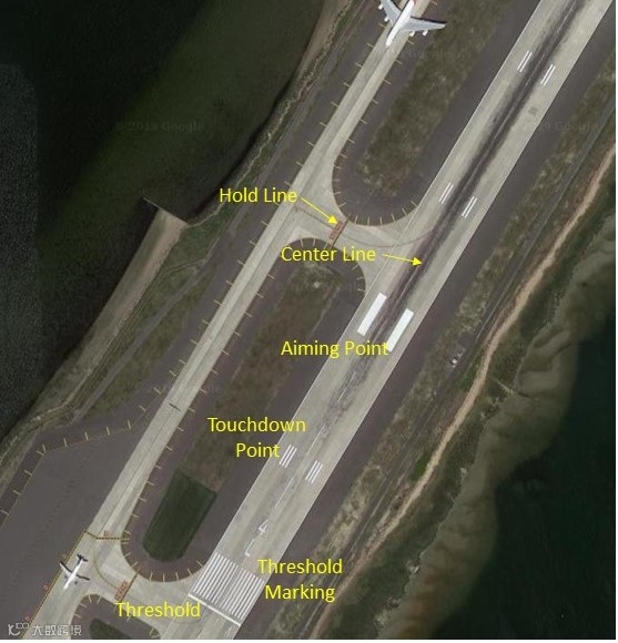 飞行员如何从空中辨识它呢?当然是通过“入口标志”(threshold marking)。典型的布局是“左八右八斑马线”。跑道上还有一些明显的标志用于辨识“接地带”(touchdown zone或 touchdown point)、“瞄准点”(aim point)和“中线”(center line)等等。