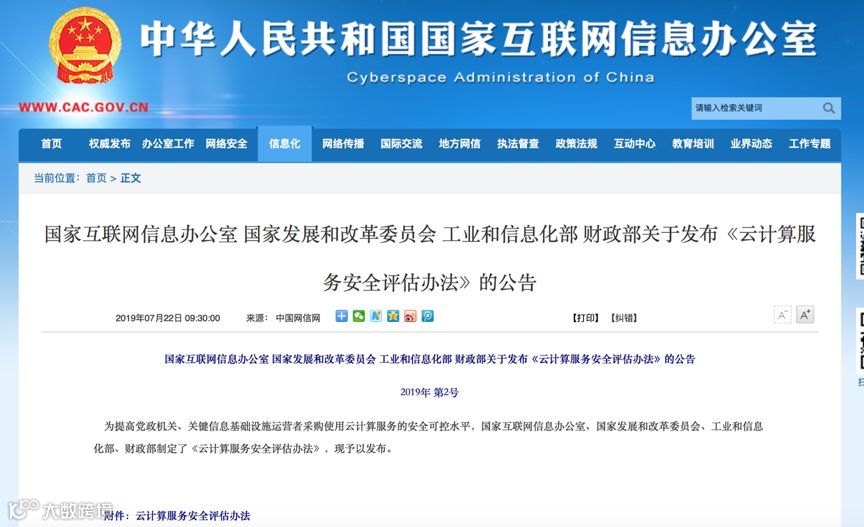 为提高党政机关、关键信息基础设施运营者采购使用云计算服务的安全可控水平,国家互联网信息办公室、国家发展和改革委员会、工业和信息化部、财政部制定了《云计算服务安全评估办法》,现予以发布。