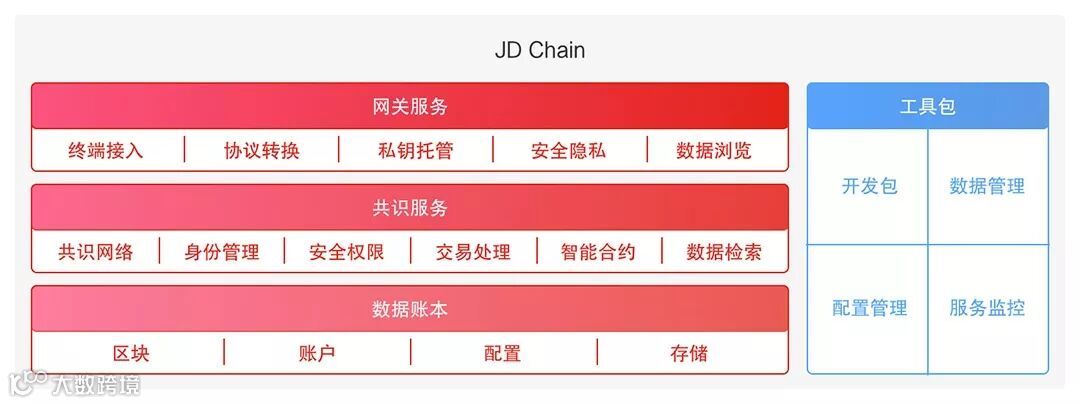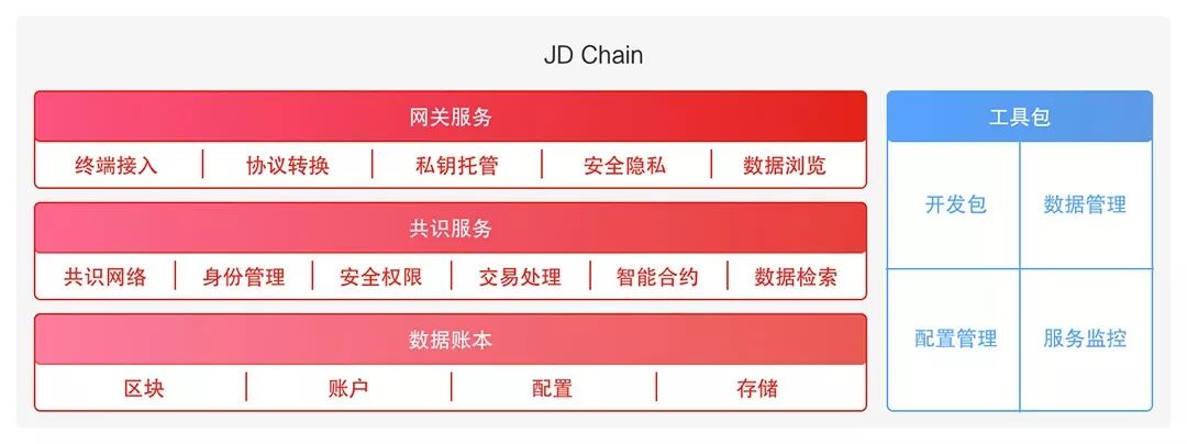 具体来说,JD Chain的功能层次分为4个部分:网关服务、共识服务、数据账本和工具包,架构体系如下图2。