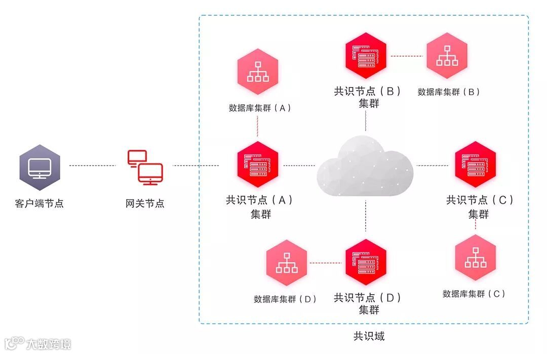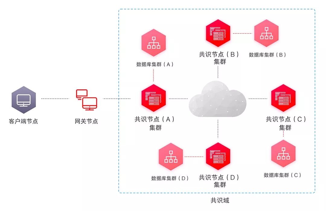 随着应用级别的提升,数据存储的需求越来越大,每个共识节点可采用数据库集群的方式实现存储的平行化扩展(在这种方式下可支持交易级别达到十亿乃至更多),如图5。在某些中型实际应用中,共识节点会由不同的业务方安装部署,将共识节点集群化提升了系统整体的安全性和可扩展性,如图6。
