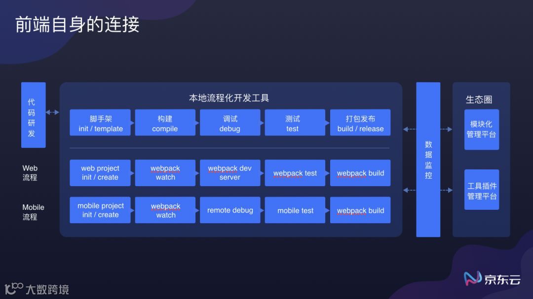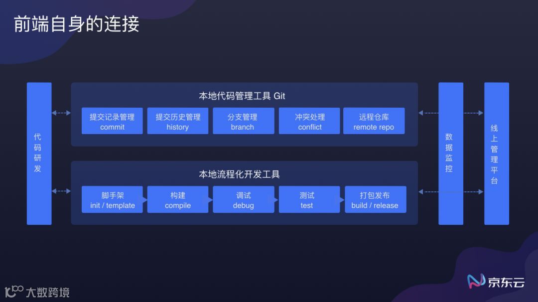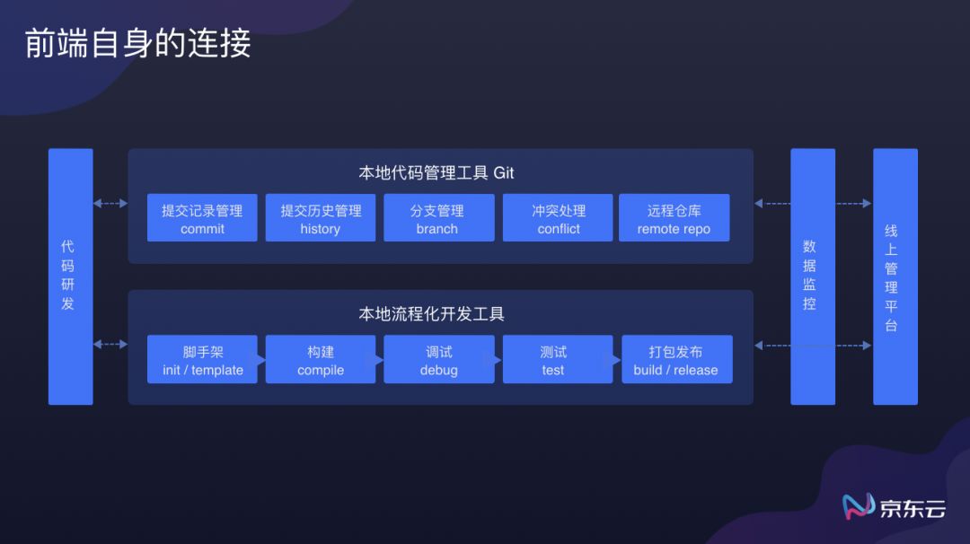 然后是前端自身的连接,除了本身的业务,我们可以再开发流程、工具化、自动化等这些方面作深入探索,而且现在社区也有许多成熟的方案。比如,如果是一个团队,我们可以通过统一的编码规范,例如通过 Eslint 或者自定义一个符合你们规范的 Eslint Plugin 或者通过 GitFlow 去统一开发流程,统一规范的 Commit 及 Review 流程。