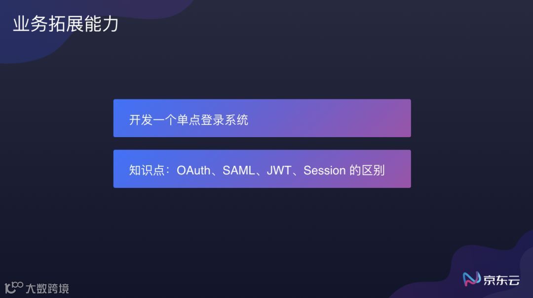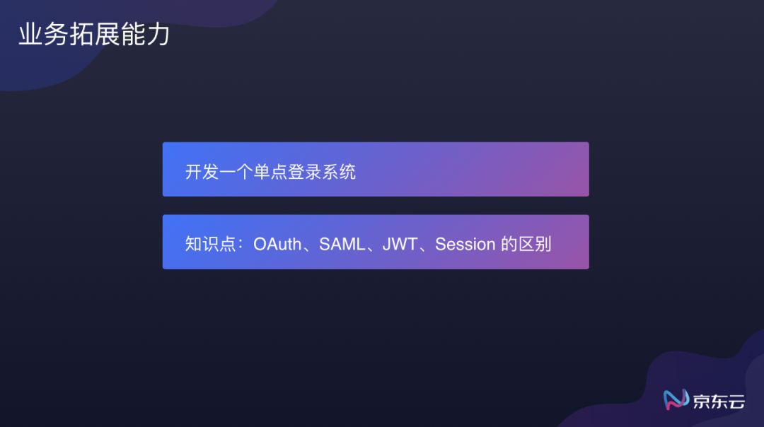 举例来说,让你做一个单点登录的页面。并不是说你写个登录表单,发几个请求就完事儿了。其中的一些知识点,例如 SSO,SSO只是一类解决方案的统称,具体的实现可以是 OAuth、SAML 等方案,其中关于认证、授权的区别 ( Authentication/Authorisation ) 是相对重要的概念,认证的作用在于认可你能够访问系统,用于鉴别访问者是否是合法用户;而授权用于决定你有访问哪些资源的权限。
