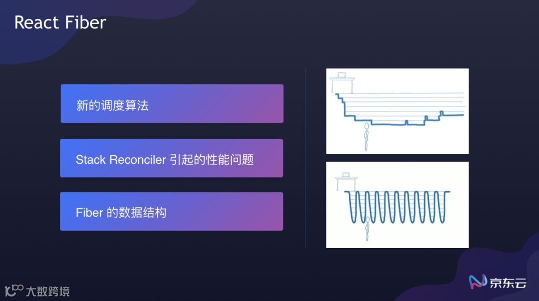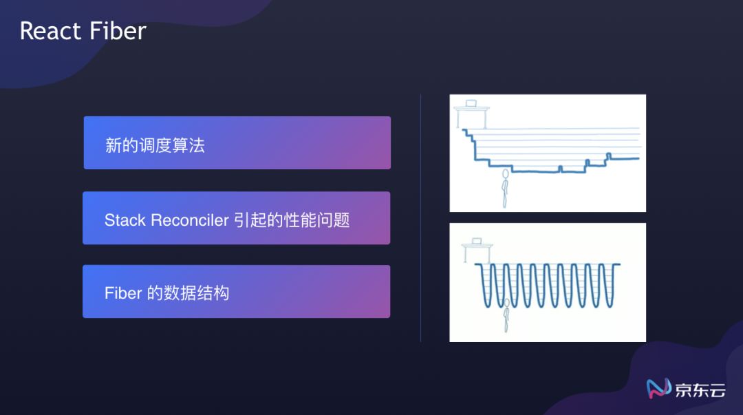 拿 React 为例,React V16 版本推出的新的 Fiber 架构,是为了解决之前可能存在的性能问题。我们知道 React 在渲染、更新组件的时候是分两个阶段的,一个叫调度阶段 Reconciler、一个是渲染阶段。React 管之前的 Reconciler 称之为 Stack Reconciler。 Stack Reconciler 采用类似函数调用栈的策略,通过 DFS,递归遍历所有 VDOM 节点,进行 Diff。这种情况一旦开始就无法中断,要等到整颗组件树都计算完成后,才会释放主线程。那这就会出现一个问题,在极端情况下,由于组件树比较复杂,导致 React 一直占用着 JavaScript 主线程,而且我们知道 JavaScript 主线程与渲染线程是互斥的,所以这期间就会造成页面的卡顿,从而影响用户体验。