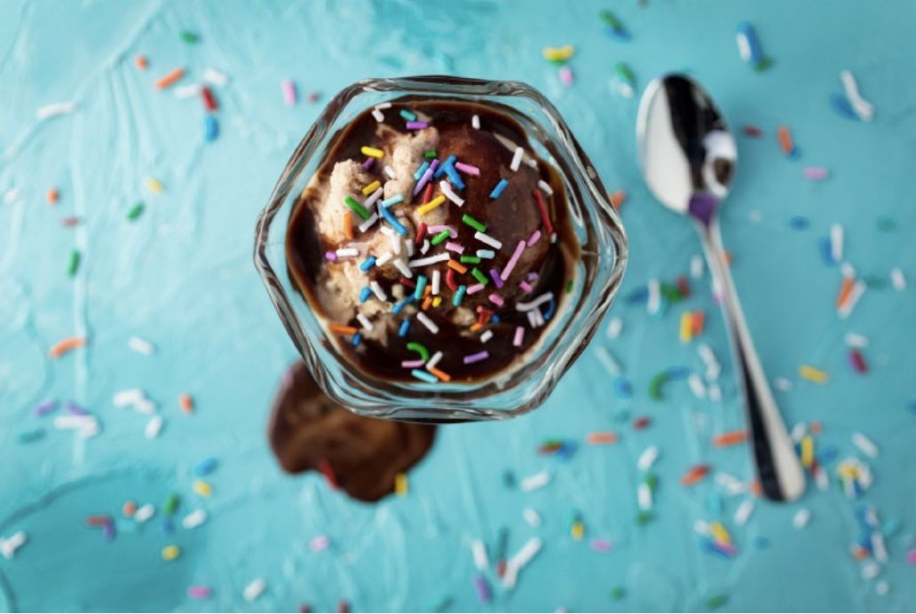 当全部都完成之后,我得到了一碗冰淇淋,上面放着两个金属勺子、一坨鲜奶油和大约300片糖屑。