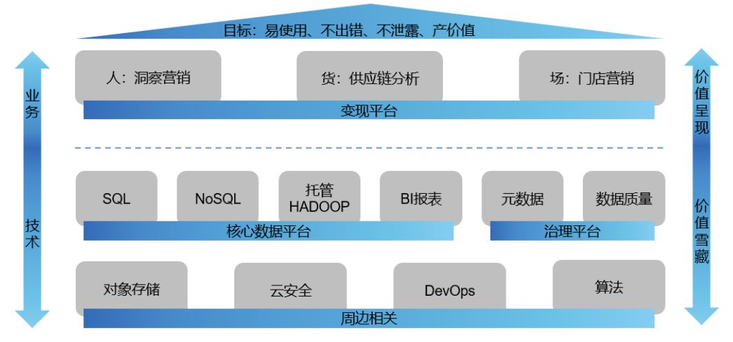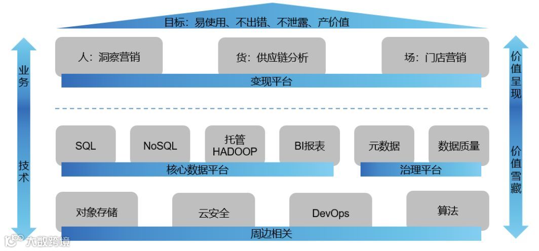 基于这些要素,今天的主题是数据,我希望京东云的数据生态可以帮助您的企业达到这样的一个数据目标:易使用(效率)、不出错(数据质量)、不泄露(数据安全)、产价值(数据变现)。