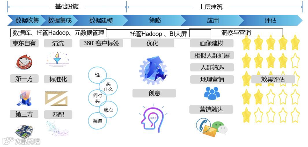 具体场景:为了仅以形象化我提到的这个思想,我们现在假设进入到一个业务模块当中,数字化营销体系。基础设施层基于集成的产品系列采集数据,集成、建模,产品包括关系数据库,Hadoop、元数据管理以及数据质量管理等等。在上层建筑层面,报表体系优化和创意营销业务,基于已有的洞察类营销类产品来做定位与触达。